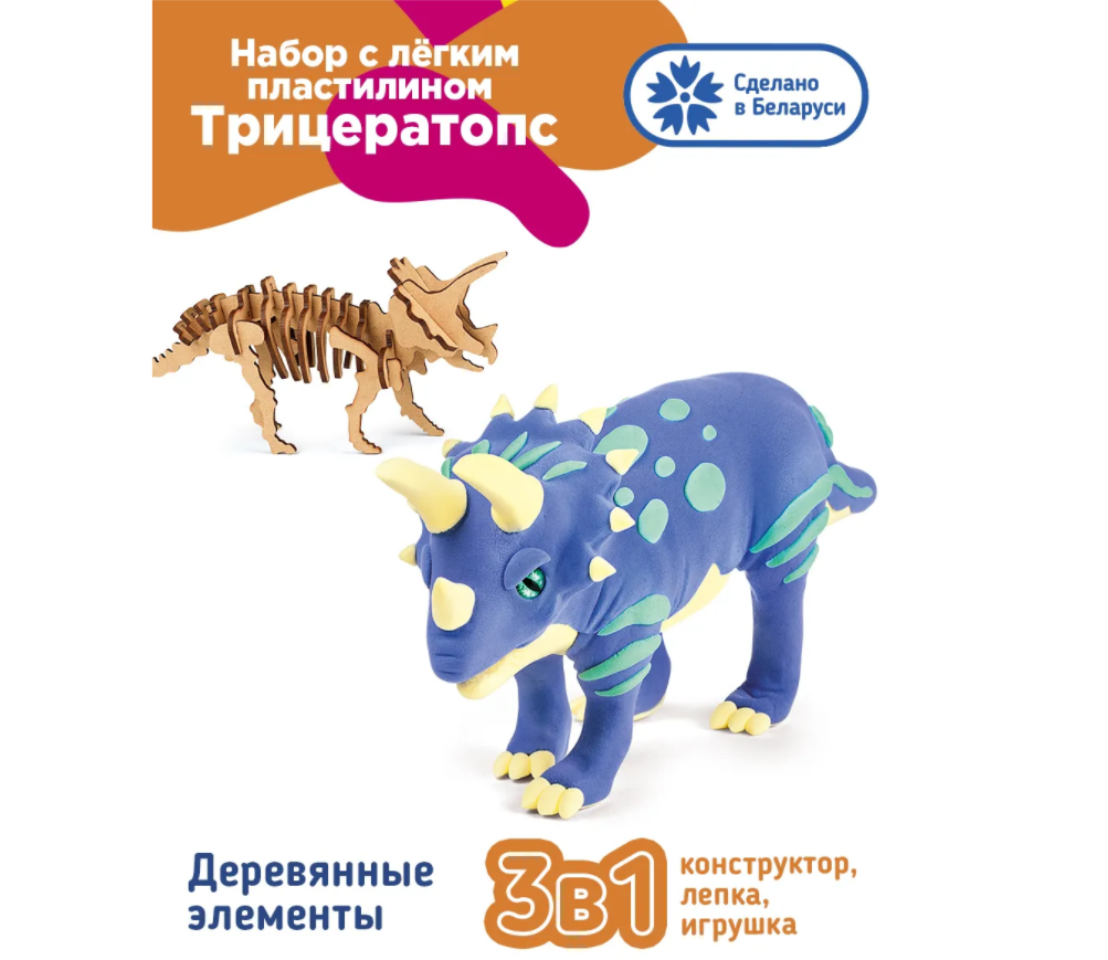 В наборе: конструктор-скелет 17 деталей, пластиковые глаза, стек, легкий пластилин 3 бруска по 35 г, легкий пластилин 2 бруска по 10 г, пакетики для хранения 3 шт., пошаговая инструкция по лепке.